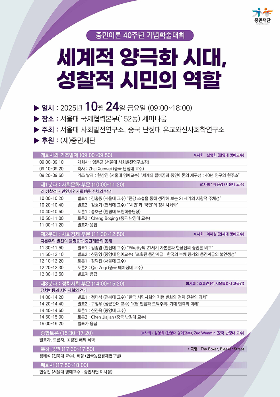 Áß¹ÎÀç´ÜÀÇ Áö¿ø ÇÏ¿¡ ¼¿ï´ë »çȸ¹ßÀü¿¬±¸¼Ò¿Í Áß±¹ ³²°æ´ë À¯Çаú½Å»çȸÇÐ ¿¬±¸¼Ò°¡ °øµ¿ÁÖÃÖÇÏ´Â ¡®Áß¹ÎÀÌ·Ð 40Áֳ⠱â³äÇмú´ëȸ¡¯°¡ 10¿ù 24ÀÏ(±Ý)¿¡ °³Ãֵ˴ϴÙ. Áß¹ÎÀÌ·ÐÀº 1980³â´ë Áß¹Ý ¹ÎÁÖÈÀÇ Àüȯ±â¿¡ Àþ°í ±³À°¼öÁØÀÌ ³ôÀ¸¸ç ¹ÎÁßÀÇ Á¤Ã¼¼ºÀ» ȹµæÇÑ °³ÇõÀû Áß»êÃþÀ» È£¸íÇÏ´Â ÀÌ·ÐÀ¸·Î µîÀåÇÏ¿´À¸¸ç, Áß¹ÎÀç´ÜÀº 2015³â ¼¿ï½Ã ½Ã¹Îû¿¡¼ Áß¹ÎÀÌ·Ð 30Áֳ⠱â³ä Çмú´ëȸ¸¦ ¿¾ú½À´Ï´Ù. ±¹³»¿ÜÀûÀ¸·Î ¾ç±ØÈÀÇ Áø¿µ´ë¸³ÀÌ °¥¼ö·Ï ½ÉȵǴ ¿À´ÃÀÇ Çö½Ç¿¡¼ Á¤Ä¡, °æÁ¦, »çȸ ¹®È ºÎ¹®¿¡ °ÉÄ£ °´°üÀû Çö½Ç Áø´Ü°ú ¼ºÂûÀû ½Ã¹ÎÀÇ ¿ªÇÒÀ» Á¶¸íÇϰíÀÚ 'Áß¹ÎÀÌ·Ð 40Áֳ⠱â³äÇмú´ëȸ'¸¦ °³ÃÖÇÏ¿À´Ï °ü½ÉÀÖ´Â ºÐµéÀÇ ¸¹Àº Âü¿© ºÎʵ右´Ï´Ù. °¨»çÇÕ´Ï´Ù. ¡Û Çà»ç¸í: Áß¹ÎÀÌ·Ð 40Áֳ⠱â³äÇмú´ëȸ(¼¼°èÀû ¾ç±ØÈ ½Ã´ë, ¼ºÂûÀû ½Ã¹ÎÀÇ ¿ªÇÒ)¡Û ÀϽÃ: 2025³â 10¿ù 24ÀÏ ±Ý¿äÀÏ (09:00-18:00) ¡Û Àå¼Ò: ¼¿ï´ë ±¹Á¦Çù·Âº»ºÎ(152µ¿) ¼¼¹Ì³ª·ë ¡Û ÁÖÃÖ: ¼¿ï´ë »çȸ¹ßÀü¿¬±¸¼Ò, Áß±¹ ³Â¡´ë À¯±³¿Í½Å»çȸÇבּ¸¼Ò ¡Û ÈÄ¿ø: (Àç)Áß¹ÎÀç´Ü ¡Û ´ë»ó: °ü½É ÀÖ´Â Çг»¿Ü ¿¬±¸ÀÚ ¹× Çлý