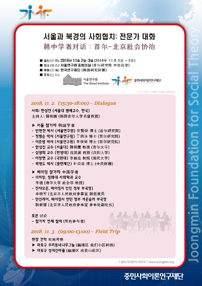 ¼¿ï°ú ºÏ°æÀÇ »çȸÇùÄ¡: ÇÑÁß Àü¹®°¡ ´ëÈ 韩ñé学íº对话: âÏ尔-ÝÁÌÈÞä会协ö½ Social Governance in Seoul and Beijing: Dialogue with Experts -ÀϽÃ: 2018³â 11¿ù 2ÀÏ(±Ý) ~3ÀÏ(Åä) -Àå¼Ò: ¼¿ï¿¬±¸¿ø, ¸¶Æ÷±¸(¿ì¸®µ¿³×³ª¹«±×´Ã&¼º¹Ì»ê¸¶À») -ÁÖÃÖ: ¼¿ï¿¬±¸¿ø, Á߹λçȸÀ̷בּ¸Àç´Ü -ÈÄ¿ø: Çѱ¹¿¬±¸Àç´Ü, ÇѾç´ë ¹ýÇבּ¸¼Ò