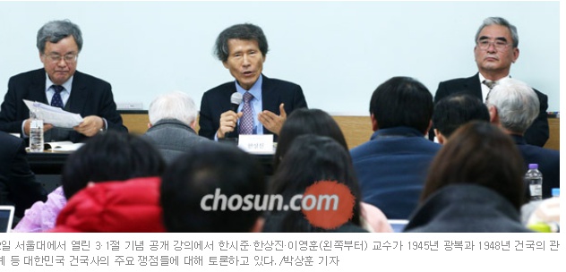 ´ëÇѹα¹ °Ç±¹»çÀÇ Áß¿ä ÀïÁ¡µéÀ» ³õ°í °¢ ÀÔÀåÀ» ´ëÇ¥ÇÏ´Â ÇÐÀÚµéÀÌ Åä·ÐÀ» ¹ú¿´´Ù. 2ÀÏ ¿ÀÈÄ ¼¿ï´ë »çȸ´ë 16µ¿ 110È£ °Àǽǿ¡¼ ¿¸° 3¡¤1Àý ±â³ä °ø°³ °ÀÇ¿¡¼ ÇÑ»óÁø ¼¿ï´ë ¸í¿¹±³¼ö(»çȸÇÐ)´Â '±¤º¹'°ú '°Ç±¹'À» ´ë¸³½ÃÄÑ ÅÃÀÏÇÏ´Â ±âÁ¸ÀÇ Á¢±ÙÀ» ºñÆÇÇÏ¸ç ¾çÀÚ¸¦ Á¶È½ÃŰ´Â Á¦3ÀÇ °üÁ¡À» Á¦½ÃÇß´Ù. À̾î 1945³â '±¤º¹'À» °Á¶ÇÏ´Â ÇѽÃÁØ ´Ü±¹´ë ±³¼ö(Çѱ¹»ç)¿Í 1948³â '°Ç±¹'À» Áß½ÃÇÏ´Â ÀÌ¿µÈÆ ¼¿ï´ë ±³¼ö(°æÁ¦»ç)°¡ Åä·ÐÀÚ·Î Âü¿©ÇØ '3»ö Åä·Ð'À» ÆîÃÆ´Ù.