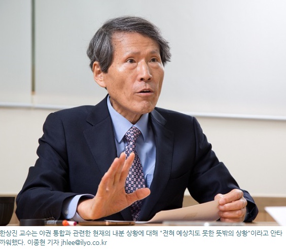 ¡ª´Ù¸¸ ÇÑ ±³¼ö²²¼µµ ¾ó¸¶ Àü ÇÑ ÀÎÅͺ信¼ ´õ¹ÎÁÖÀÇ ³»ºÎ°³Çõ, ƯÈ÷ ¹® Àü ´ëÇ¥ÀÇ Á¤°èÀºÅ𸦠Æ÷ÇÔÇÑ Ä£³ë û»êÀ» ÀüÁ¦ÇÑ´Ù¸é ¾ß±Ç ¿¬´ë¿¡ ´ëÇØ »ý°¢ÇÒ ¼ö ÀÖ´Ù°í Çϼ̴Ù. ¡°ÁøÁ¤ ÅëÇÕÀ» ¿øÇÑ´Ù¸é, À̸¦ °¡·Î¸·¾Ò´ø °ÍÀÌ ¹«¾ùÀÎÁö ã¾Æ¾ß ÇÑ´Ù. ¹°·Ð Ä£³ë¼¼·ÂÀÌ ¹èÈÄ¿¡ ÀÖÁö¸¸ ±× º¹ÆÇÀÌ ¹® Àü ´ëÇ¥´Ù. ÅëÇÕÀ» ³íÀÇÇÏ·Á¸é ±× Ã¥ÀÓÀÚ(¹® Àü ´ëÇ¥)°¡ °ú¿À¸¦ ÀÎÁ¤ÇÏ°í ±×¸¸µÎ°Ú´Ù°í Çϸé ÅëÇÕÀÌ µÉ ¼ö ÀÖ´Ù. ¿Ö? ¿øÀÎÀÌ »ç¶óÁ³À¸´Ï±î. ´ÜÁö Ä£³ë ¸î ¸íÀÌ Á¦°ÅµÈ´Ù°í Ä£³ë¼¼·Â Àüü°¡ û»êµÇ´Â °ÍÀÌ ¾Æ´Ï´Ù.¡±